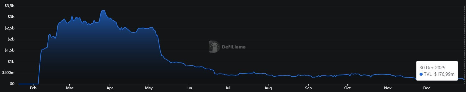 Tổng giá trị bị khóa (TVL) của Berachain đạt đỉnh trên 3,3 tỷ USD vào đầu năm 2025, sau đó giảm mạnh hơn 90% xuống còn khoảng 176 triệu USD vào cuối năm.