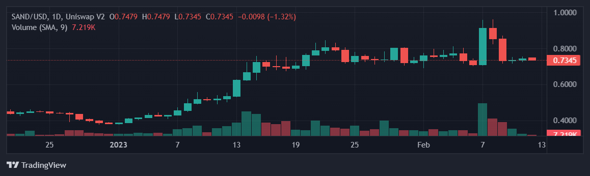 Trong khi đó, token gốc SAND của game Metaverse The Sandbox tăng 87,18% tính đến ngày 25/1 và tiếp tục tăng trong tháng 2, thêm tới 107,63% so với đầu năm vào thời điểm viết bài, theo dữ liệu mới nhất thu được vào ngày 9/2.