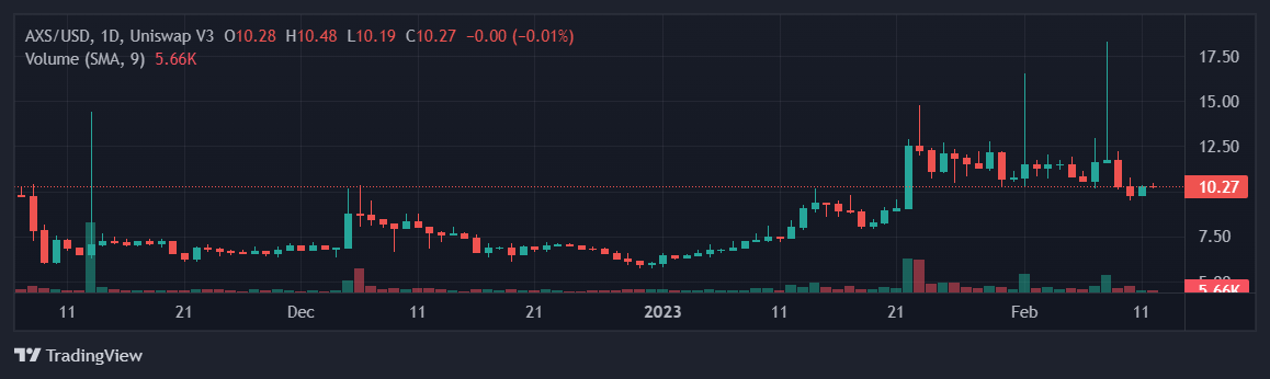AXS hiện đang giao dịch tại 10,27 đô la, ghi nhận mức tăng 82,11% so với đầu năm. Tình trạng của nó hầu như không thay đổi kể từ ngày 25/1, theo đó ghi nhận mức tăng giá 85,16% so với đầu năm, như Delphi Digital đã báo cáo.