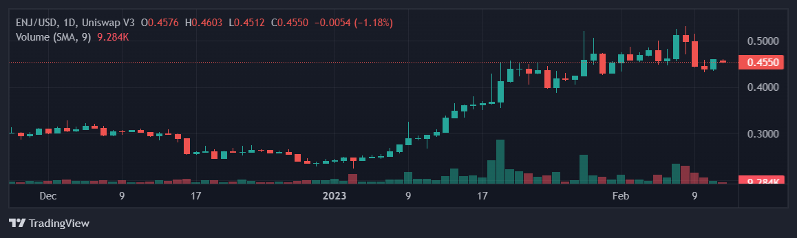 Đối với Enjin Coin (ENJ), token của nền tảng game xã hội Enjin Network tăng 70,83% trong tháng 1 và kết thúc ở mức giá 0,455 đô la tính đến thời điểm viết bài, tương ứng với mức tăng 108,68% kể từ khi chuyển sang năm mới.