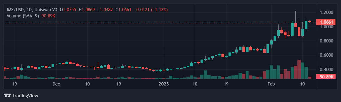 Tăng trưởng 81,58% từ ngày 1/1 đến 25/1, ImmutableX (IMX) – nền tảng cơ bản của game Gods Unchained kể từ đó ghi nhận kết quả thậm chí còn ấn tượng hơn trong tuần đầu tiên của tháng 2, hiện đạt mức tăng đột biến 180,43% so với đầu năm ở mức 1,066 đô la.