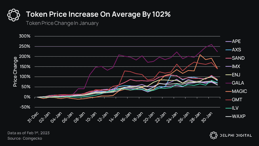 Thật vậy, tổng tỷ lệ tăng giá của 10 token game hàng đầu theo vốn hóa thị trường trong tháng trước đã lên tới 102%. Đây là một trong những điểm nổi bật của báo cáo January Gaming Roundup từ nền tảng phân tích tiền điện tử Delphi Digital xuất bản vào ngày 6/2.
