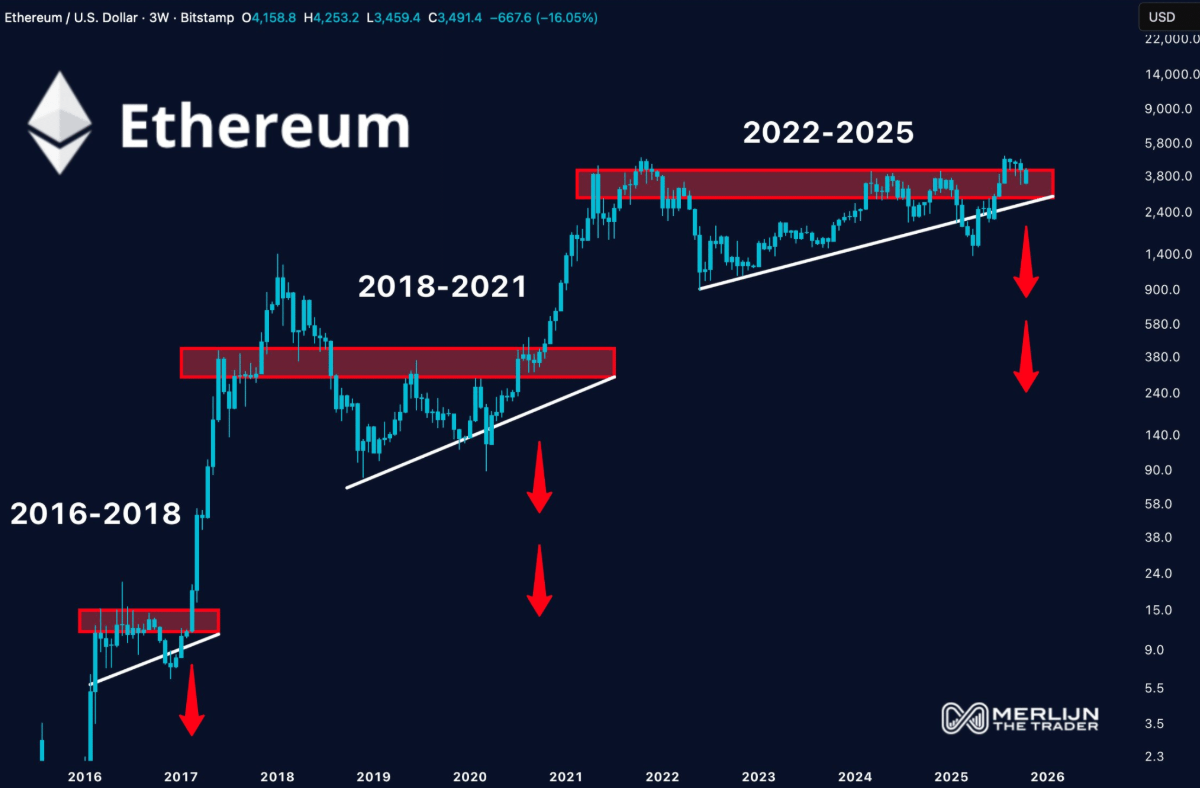 Theo các chuyên gia phân tích, Ethereum (ETH) đang trải qua một giai đoạn tích lũy kéo dài, tương tự những mô hình nén giá từng xuất hiện trong các chu kỳ 2016–2018 và 2018–2021 – cả hai đều kết thúc bằng những cú bứt phá ngoạn mục.