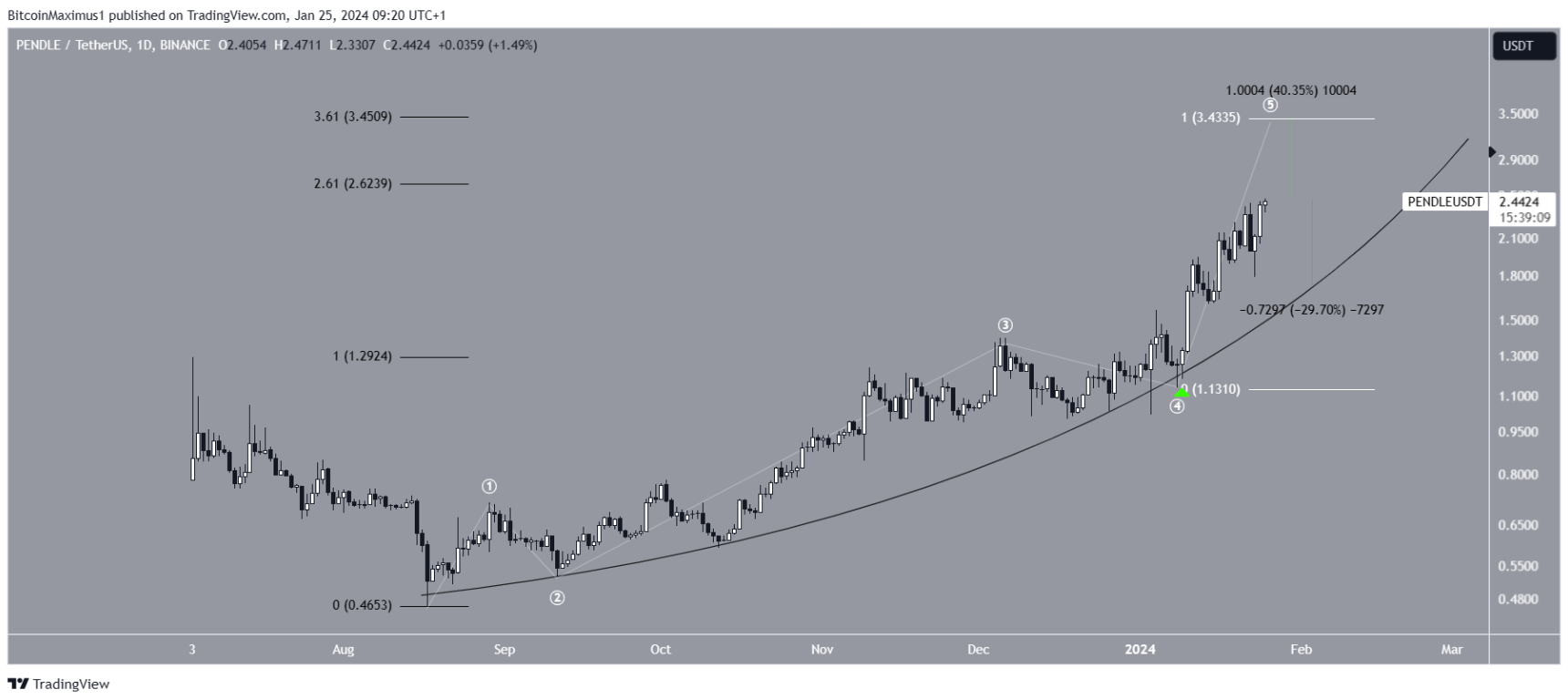 Giá PENDLE đã tăng cùng với đường hỗ trợ parabol tăng dần kể từ tháng 8 năm 2023. Đường xu hướng đã được xác thực nhiều lần, gần đây nhất là vào ngày 8 tháng 1 (biểu tượng màu xanh lá cây). PENDLE đã đạt mức cao nhất mọi thời đại mới ở $2,47 vào ngày hôm nay.