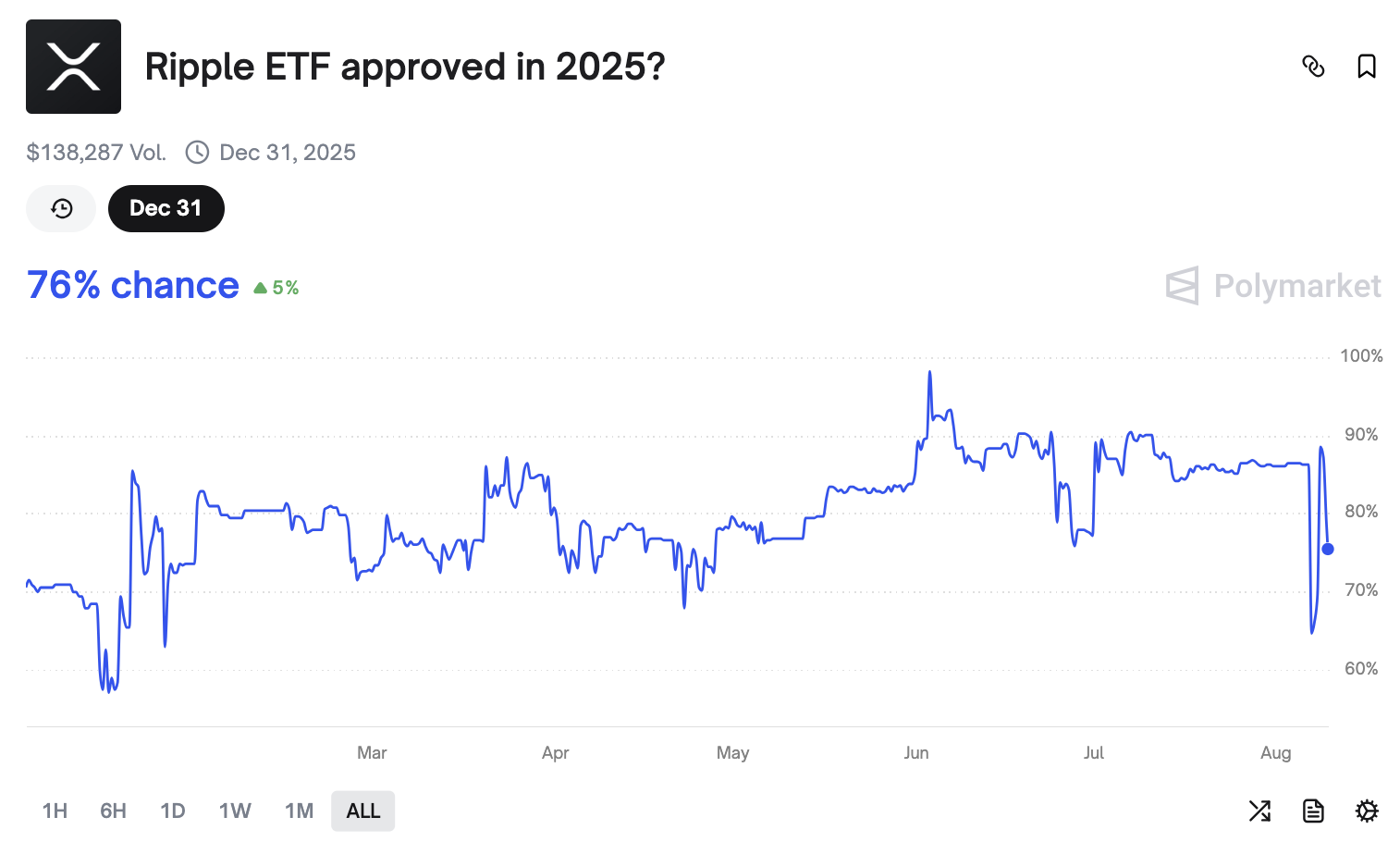 Thông tin về việc BlackRock không có ý định tung ra ETF XRP giao ngay đã khiến tỷ lệ cược cho quỹ này giảm xuống còn 76% trên Polymarket tính đến thời điểm viết bài, thấp hơn nhiều so với mức hơn 98% được ghi nhận vào đầu tháng 6. Tuy nhiên, nhà phân tích ETF cấp cao của Bloomberg, Eric Balchunas, vẫn duy trì tỷ lệ quỹ này được duyệt trong năm nay là 95%.