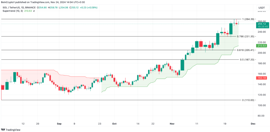 Mặt khác, nếu hoạt động chốt lời gia tăng, SOL sẽ mất một phần lợi nhuận hiện tại để giao dịch tại $231,35. Nếu không thể giữ giá trên mức này, SOL sẽ giảm xuống mức hỗ trợ được hình thành bởi chỉ báo Super Trend ở mức $213,53. Điều này sẽ dập tắt khả năng SOL đạt mức đỉnh kỷ lục mới trong thời gian tới.