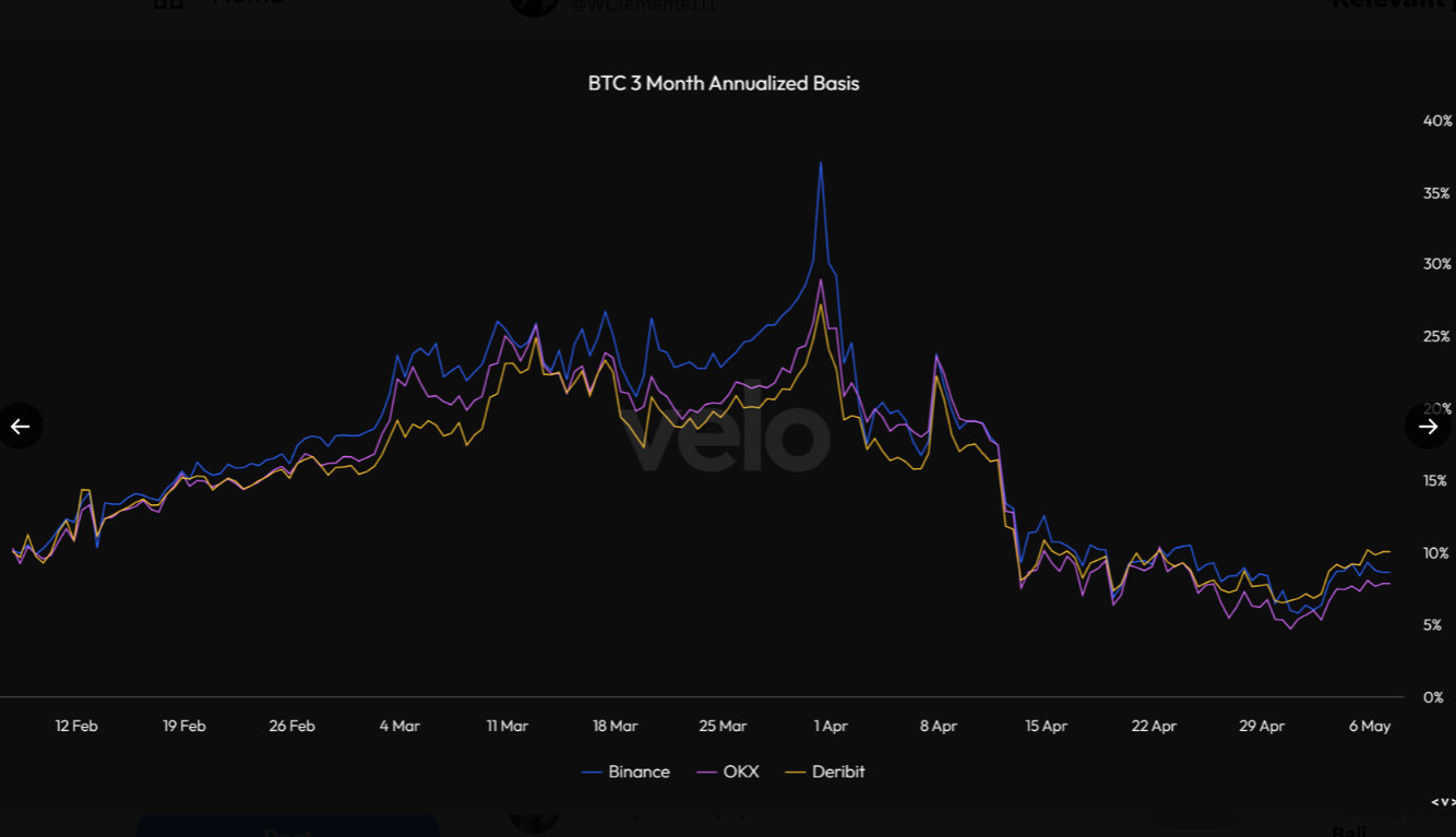 “Có vẻ như BTC đang củng cố trước đợt tăng giá tiếp theo,” Will Clemente, nhà đồng sáng lập Reflexivity Research, đã viết trong một bài đăng ngày 7 tháng 5 trên X, giải thích rằng funding rate và lãi suất cơ bản của Bitcoin đã “hạ nhiệt” sau một thời gian ngắn giảm xuống mức âm.