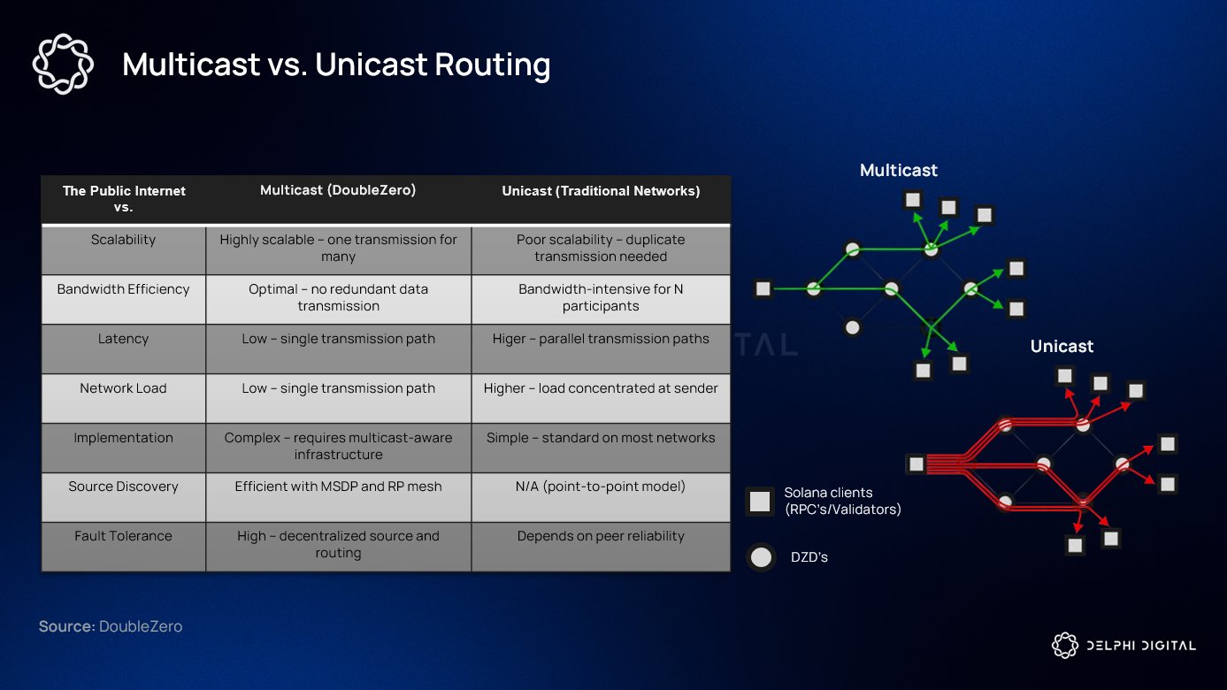Điều này đặc biệt quan trọng với Alpenglow, bởi mô hình finality mới yêu cầu các validator nhận và phản hồi thông điệp trong những khung thời gian rất hẹp. Việc thu hẹp chênh lệch độ trễ giúp Votor hoàn tất block nhanh hơn và Rotor phân phối dữ liệu đồng đều hơn. DoubleZero cũng hỗ trợ multicast, cho phép nhân bản và phân phối dữ liệu đồng thời tới nhiều validator.
