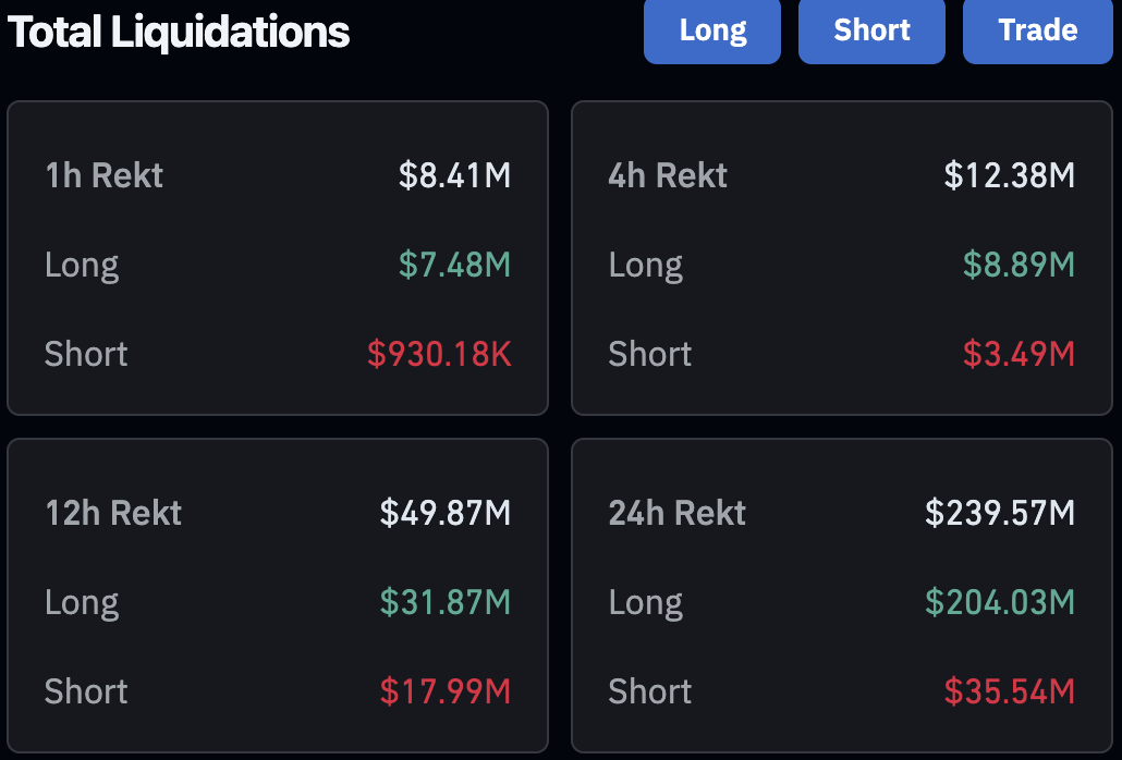 Trong 24 giờ qua, các trader hợp đồng tương lai suy đoán về giá tiền điện tử cao hơn đã chứng kiến khoản thanh lý khoảng 239 triệu USD. Sự suy thoái của thị trường xảy ra khi việc phê duyệt các quỹ Bitcoin ETF giao ngay tiếp tục tạo ra tâm lý “bán sự thật”, với việc các trader không có dấu hiệu chậm lại việc đặt cược trái ngược của họ.