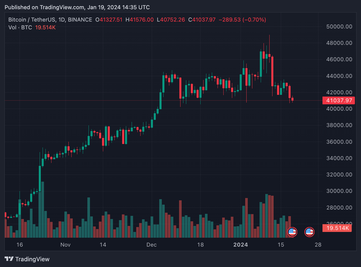 Giá Bitcoin đã giảm xuống 41.000 USD vào cuối ngày thứ Năm, đánh dấu mức giảm 3,7% trong ngày và giảm 15% so với mức đỉnh tháng 12 là 49.000 USD. Sự suy giảm này có tác động lan tỏa đến thị trường tiền điện tử rộng lớn hơn, với Ethereum (ETH) giảm 2,5%, SOL của Solana giảm 6,5% và ADA của Cardano mất 5% giá trị.