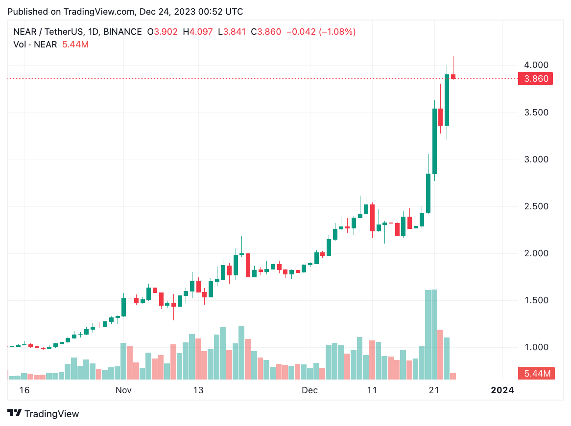 Vào thời điểm viết bài, NEAR có giá trị 3,8 USD, đánh dấu mức tăng hàng tuần gần 64%.