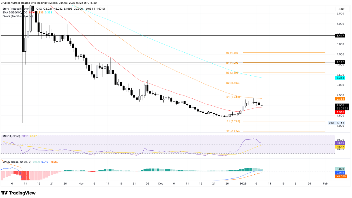 Tại thời điểm viết bài vào ngày thứ Năm, Story (IP) đang dao động quanh mốc 2,00 USD, ghi nhận phiên giảm thứ ba liên tiếp. Giá giảm 2% trong ngày, nối tiếp mức sụt 4% của phiên trước đó, qua đó gia tăng áp lực điều chỉnh và đặt đồng coin này trước nguy cơ đánh mất đường EMA 20 ngày tại vùng 1,91 USD.