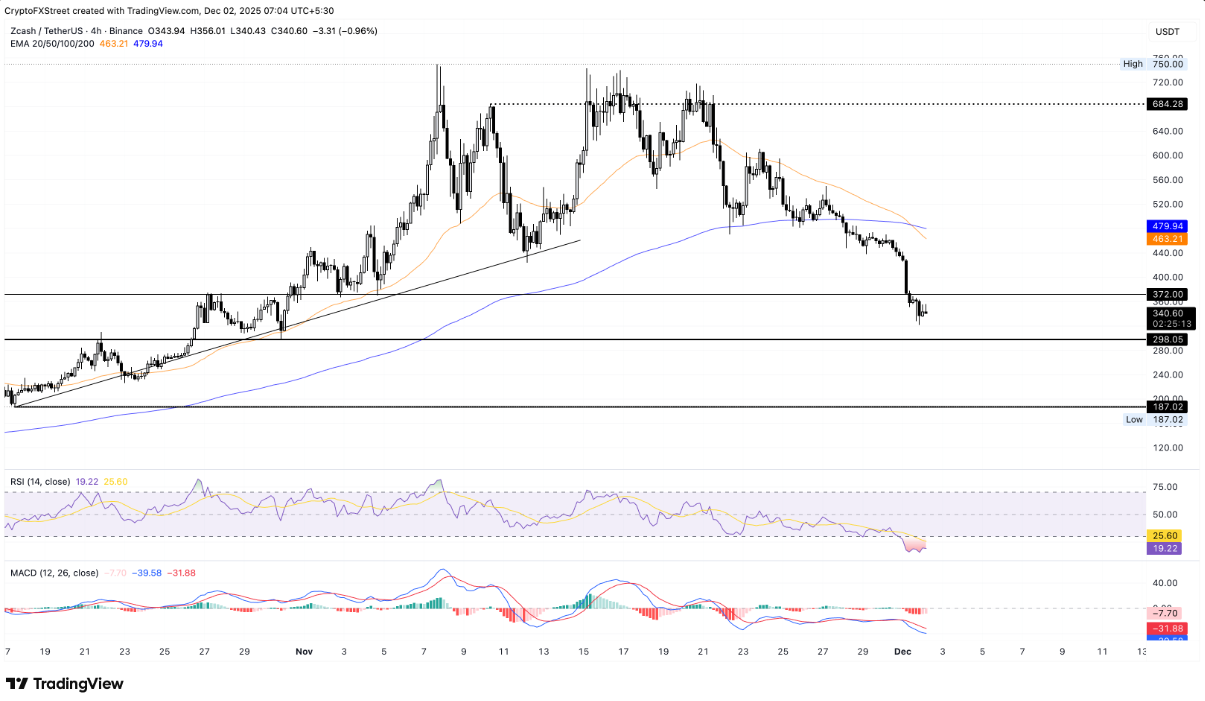 Zcash đã đánh mất mốc 350 USD sau khi lao dốc 19% trong phiên giao dịch ngày thứ Hai, mở ra một khởi đầu u ám cho tuần mới. Đến thời điểm hiện tại, đà giảm vẫn chưa có dấu hiệu dừng lại khi ZEC tiếp tục mất thêm khoảng 3% trong phiên thứ Ba, từng bước trượt sâu về vùng hỗ trợ tâm lý quan trọng quanh 300 USD.