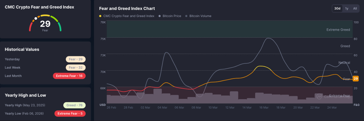 Các altcoin lớn như Ethereum (ETH), Ripple (XRP) và Solana (SOL) đồng loạt chìm trong sắc đỏ, giảm từ 3% đến 5% trong ngày, phản ánh áp lực bán gia tăng. Chỉ số Fear & Greed Crypto của CoinMarketCap nằm ở mức 29 trong phiên thứ Sáu, cho thấy tâm lý né rủi ro vẫn đang chi phối thị trường.