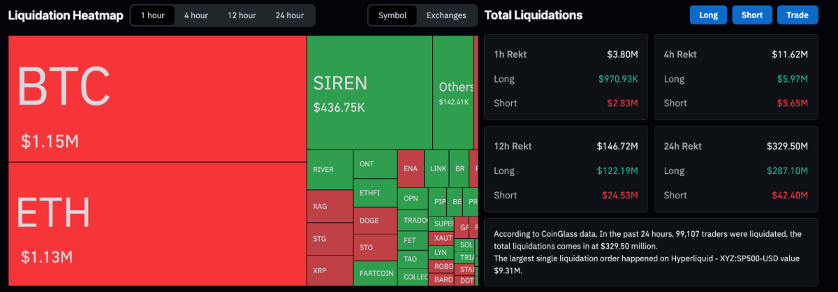 Dữ liệu từ CoinGlass tiếp tục củng cố bức tranh tiêu cực khi tổng giá trị thanh lý đạt 329,5 triệu USD trong 24 giờ, trong đó các vị thế Long chiếm tới 287,1 triệu USD, cho thấy phe gấu đang nắm ưu thế rõ rệt.