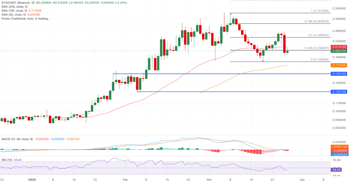 Kite ghi nhận mức tăng hơn 4% vào thời điểm viết bài ngày thứ Sáu, sau khi đã lao dốc tới 19% trước đó. Dù có nhịp hồi, xu hướng ngắn hạn vẫn chuyển sang tiêu cực khi giá đóng cửa dưới ngưỡng Fibonacci thoái lui 23,6% tại 0,2064 USD, được xác định từ đỉnh 0,3125 USD xuống đáy 0,1800 USD.