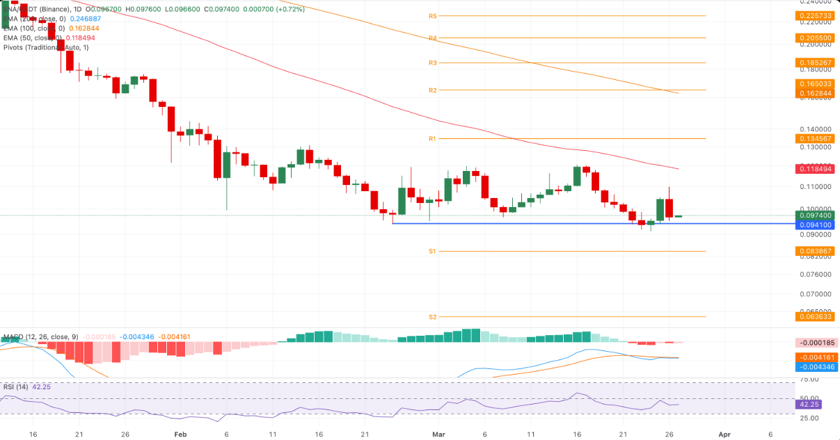 Về kỹ thuật, vùng hỗ trợ quan trọng gần nhất nằm tại 0,0941 USD; nếu mốc này bị phá vỡ, giá có thể lùi sâu về Pivot S1 tại 0,0838 USD. Ở chiều ngược lại, kháng cự gần xuất hiện quanh 0,1099 USD và trùng với EMA 50 ngày tại 0,1185 USD. Chỉ khi đóng cửa vượt lên trên khu vực này, triển vọng phục hồi mới được củng cố, với mục tiêu tiếp theo hướng tới Pivot R1 tại 0,1345 USD.