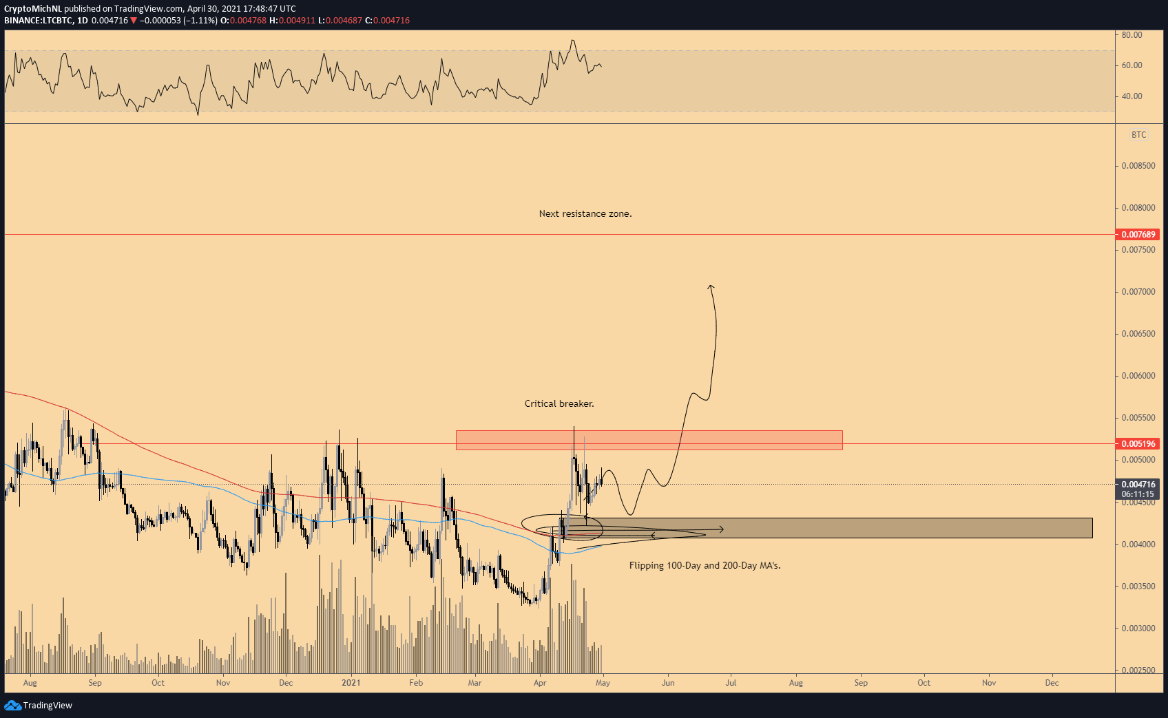 Chiến lược gia cũng đang theo dõi chặt chẽ Litecoin, mà theo anh đã sẵn sàng kích hoạt động thái 65% so với Bitcoin (LTC / BTC).