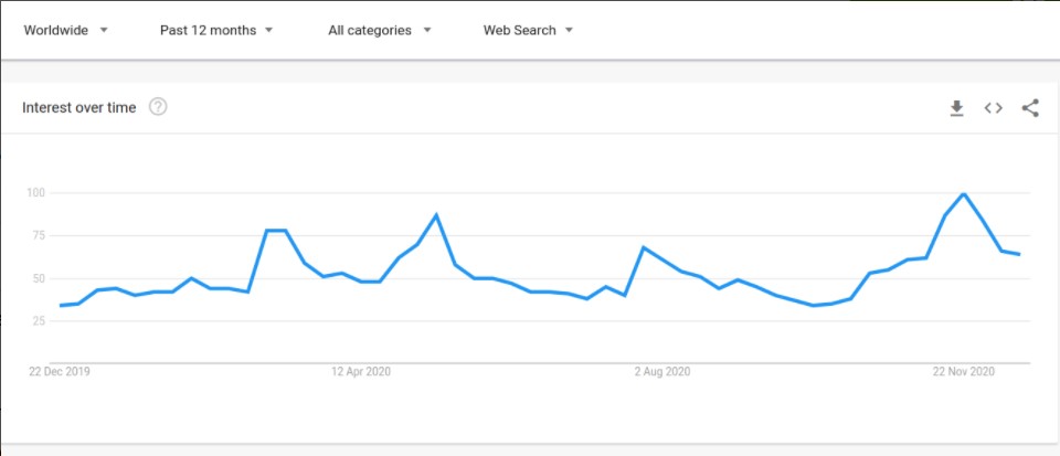 Điều này cũng đúng khi quan sát mức độ phổ biến của Bitcoin trên Wikipedia. Số lần xem trang vào tháng 12/2020 chỉ tăng nhẹ trên mức thường thấy.