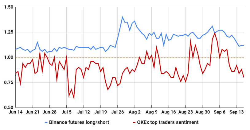 Các trader hàng đầu trên sàn Binance vẫn giữ nguyên vị trí long, mặc dù tỷ lệ 1,12 hiện tại là con số thấp nhất được ghi nhận kể từ ngày 25 tháng 7 (8 tuần trước). Xu hướng tương tự được mô tả trong chỉ số tâm lý các trader hàng đầu của OKEx, đã giảm xuống 0,80 từ mức đỉnh 1,18 vào ngày 3 tháng 9.