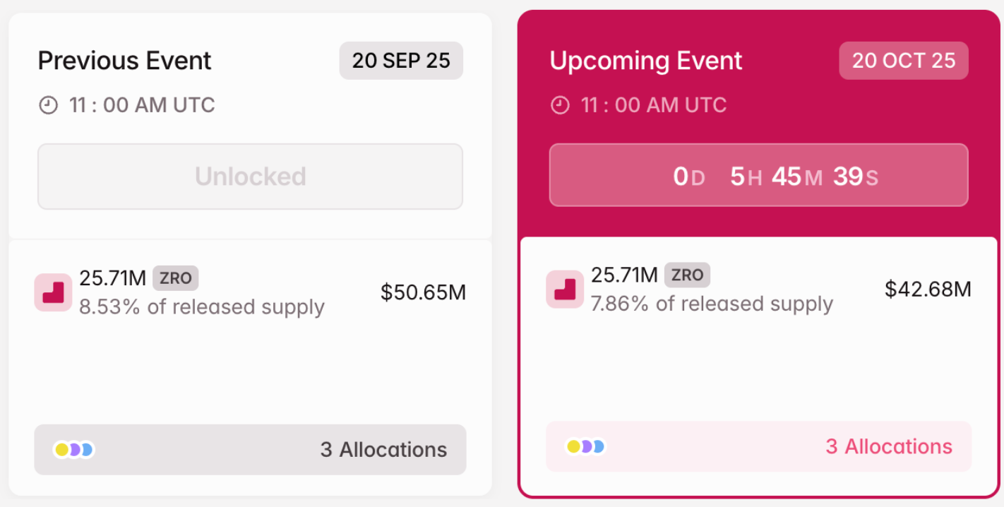 Vào ngày 20/10 tới, LayerZero sẽ mở khóa 25,71 triệu token ZRO, tương đương khoảng 42,68 triệu USD — chiếm 7,86% tổng nguồn cung đang lưu hành trên thị trường.