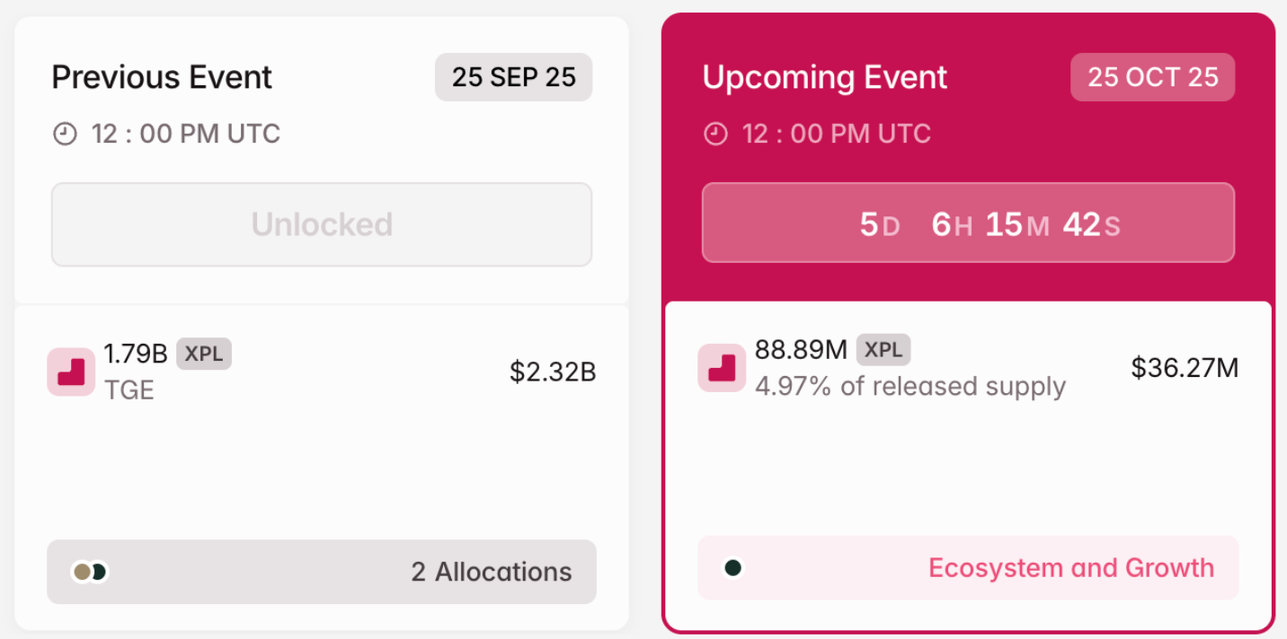 Theo kế hoạch, Plasma sẽ mở khóa 88,89 triệu XPL vào ngày 25/10, với tổng giá trị ước tính khoảng 36,27 triệu USD, tương đương 4,97% nguồn cung lưu hành hiện tại.