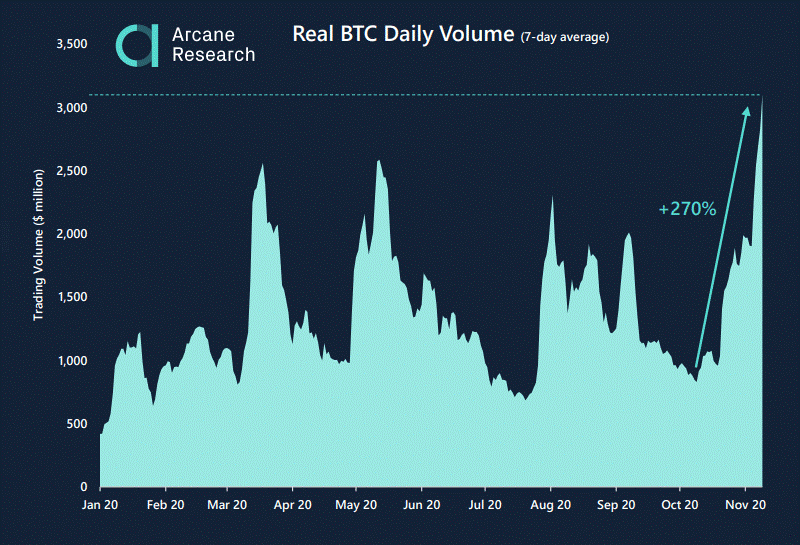 Kể từ cuối tháng 10 năm nay, khối lượng giao ngay của Bitcoin tăng hơn 270%. Quá trình này trùng với đợt phục hồi giá BTC trên 15,000 đô la và retest (kiểm tra lại) mức kháng cự 16,000 đô la.