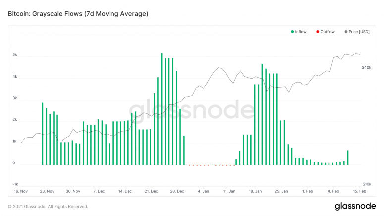Theo nguồn dữ liệu Glassnode, mức trung bình dòng vào trong 7 ngày đạt đỉnh vào giữa tháng 1 và đang có xu hướng đi xuống kể từ đó (trừ khi tăng vào thứ 6). Trong khi các nhà đầu tư bán lẻ giao dịch trên thị trường giao ngay, nhiều nhà đầu tư tổ chức tiếp xúc với Bitcoin thông qua Quỹ tín thác Bitcoin Grayscale (GBTC) được quy định.