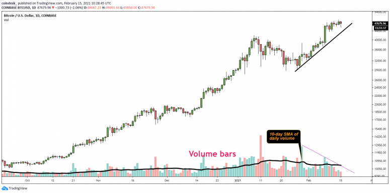 Mức tăng gần đây từ 30.000 đô la lên 49.000 đô la thiếu sự hỗ trợ về khối lượng trên các sàn giao dịch nổi bật như Coinbase.