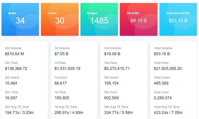 Theo dữ liệu do Multichain cung cấp, giao thức đã xử lý tổng khối lượng trị giá 53,15 tỷ USD kể từ khi ra mắt, với 19,08 tỷ USD trong số đó được giao dịch chỉ trong 30 ngày qua. Hiện có 485.399 người dùng đã tương tác với giao thức Multichain, với gần 2,256 triệu giao dịch.