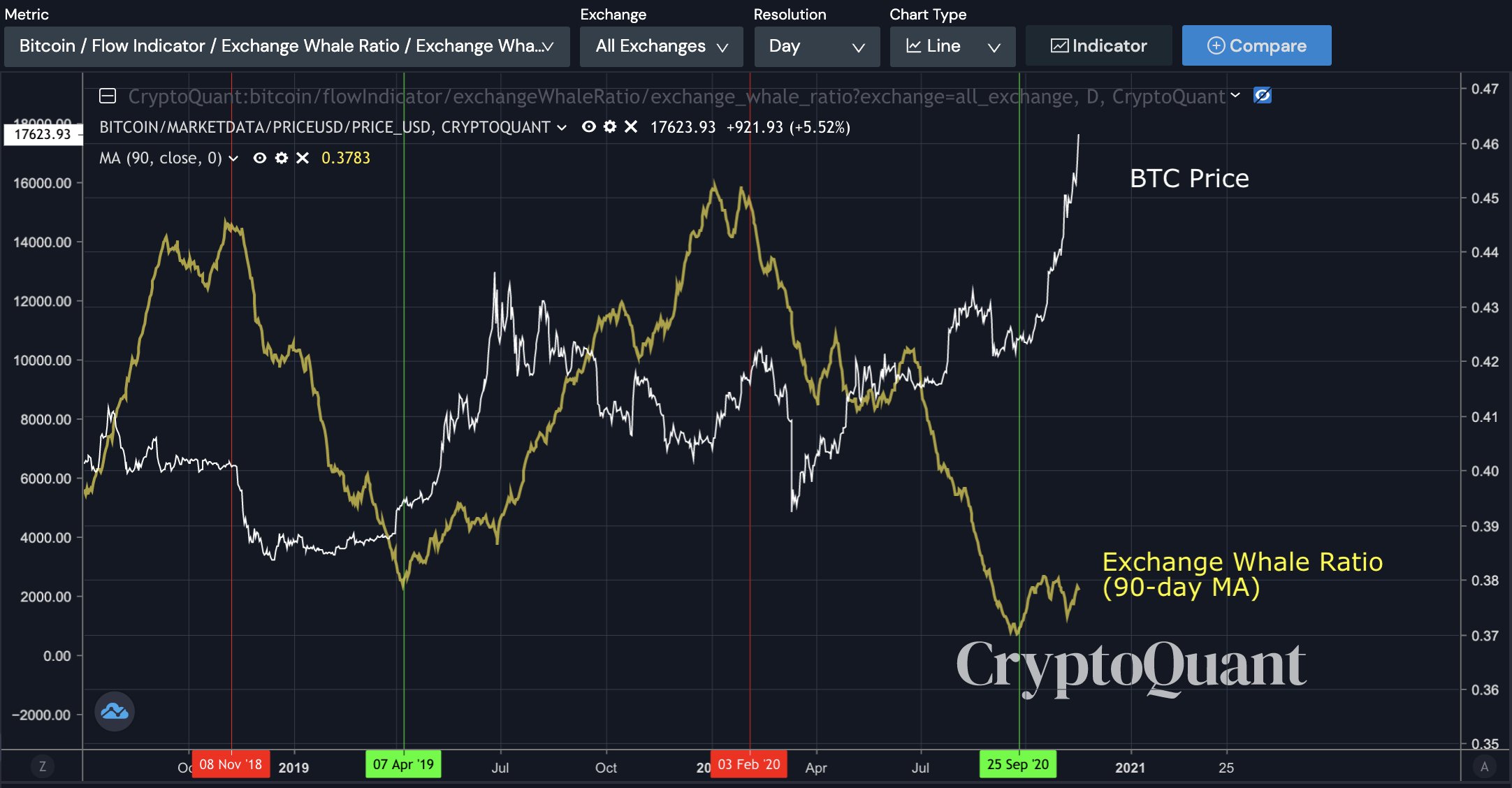 Theo dữ liệu từ CryptoQuant, cá voi không bán một lượng lớn BTC. Xu hướng này đáng chú ý vì Bitcoin đang kiểm tra mức kháng cự nhiều năm ở mức 18.000 đô la.