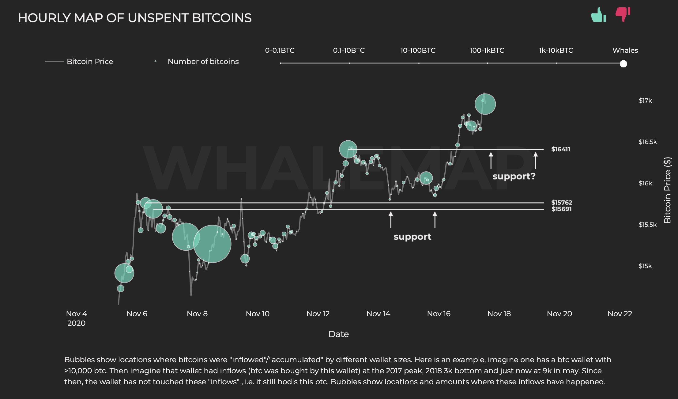 “Bong bóng cho biết mức giá mà cá voi đã mua mà chúng hiện đang nắm giữ. Bong bóng cũng hiển thị các mức hỗ trợ. Lần trước, chúng đã tăng từ $ 15.762 và tăng giá 15%. Bong bóng mới ở mức 16.411 đô la cũng sẽ giữ vững vào thời điểm này?”