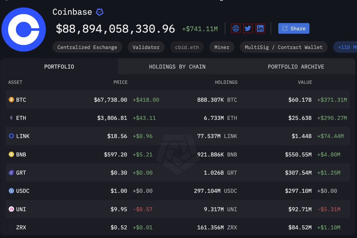 Vào thời điểm đó, Coinbase nắm giữ 928.743 BTC, nhưng hiện chỉ còn 888.307 BTC, đánh dấu mức giảm 40.436 BTC mà Coinbase nắm giữ, trị giá hơn 2,7 tỷ USD. Vào ngày 1 tháng 4, khi BTC được giao dịch ở mức trên 71.000 USD, tài sản của Coinbase trị giá 66 tỷ USD nhưng hiện chỉ còn 60,17 tỷ USD.