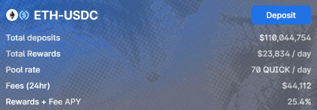 Như đã thấy trong hình trên, việc cung cấp thanh khoản cho pool ETH/USDC trên QuickSwap sẽ mang lại cho nhà đầu tư tỷ lệ 23.098 đô la phần thưởng hàng ngày và APY phí là 33,81%.