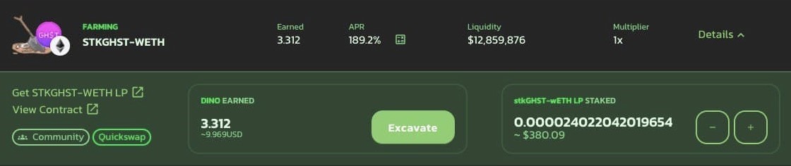 Lợi nhuận cao thường được thanh toán bằng token gốc của nền tảng như đã thấy ở trên, trong đó người dùng đã gửi token vào pool thanh khoản cho cặp STKGHS/WETH có lãi suất hàng năm là 189,2% và cho đến nay đã tạo ra phần thưởng là 3,312 DINO.