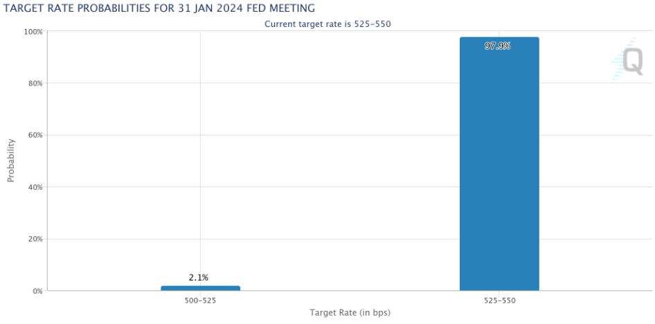 Theo dữ liệu từ FedWatch Tool của CME Group, tỷ lệ Fed giữ lãi suất ở mức hiện tại sau ngày 31/1 là gần 98%.