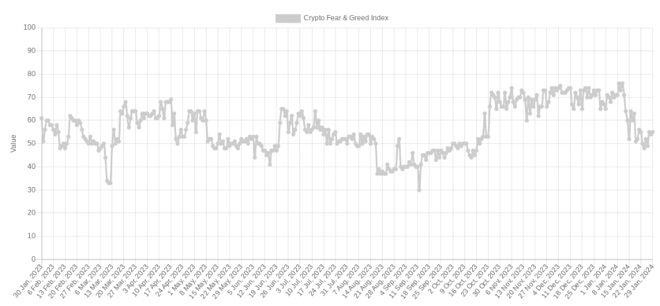 Theo dữ liệu từ Chỉ số sợ hãi và tham lam tiền điện tử, tâm lý đối chung của thị trường đã chạm mức thấp nhất trong ba tháng vào ngày 24/1.