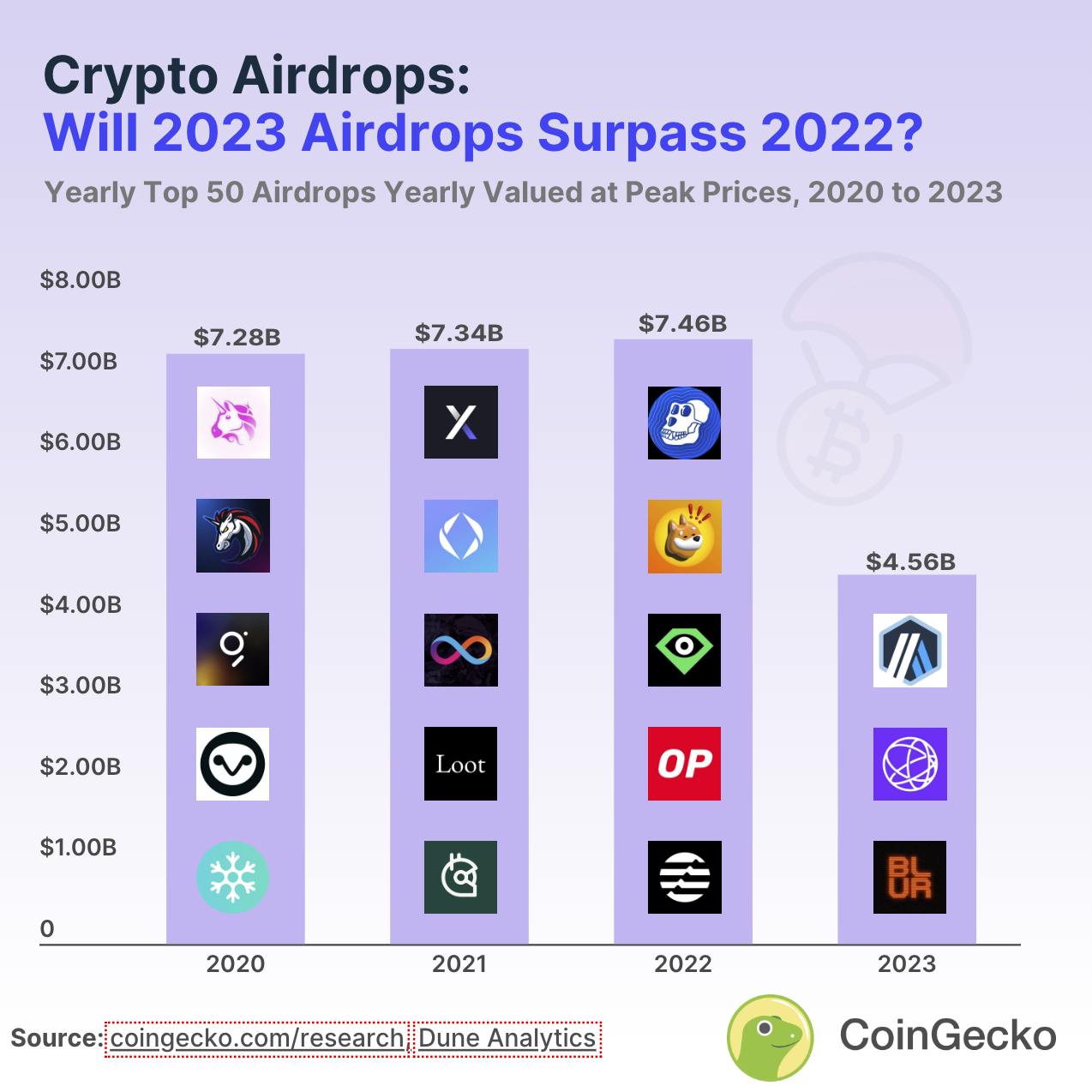 13 trong số 50 đợt airdrop tiền điện tử vào năm 2023 đã lọt vào top 50, phân phối số token trị giá 4,56 tỷ USD tính theo giá ATH của chúng.
