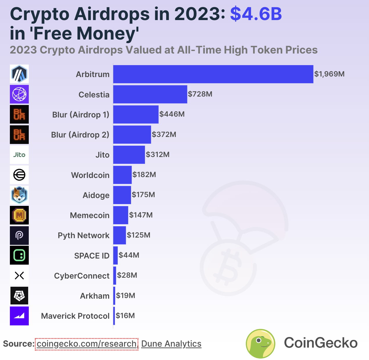 Arbitrum (ARB) là đợt airdrop tiền điện tử lớn nhất vào năm 2023, phân phối ARB trị giá 1,97 tỷ USD vào ngày 23 tháng 3 năm 2023 tính theo giá ATH là 1,69 USD. Đáng chú ý, đợt airdrop tiền điện tử của Arbitrum lớn hơn 2,9 lần so với đối thủ cạnh tranh gần nhất của nó, Optimism (OP), đã phân phối OP trị giá 0,67 tỷ USD vào ngày 31 tháng 5 năm 2022. Hệ sinh thái Arbitrum phát triển mạnh nhờ dự đoán về đợt airdrop tiền điện tử ARB, trong đó tổng giá trị bị khóa (TVL) tăng 147,2% từ 1,49 tỷ USD vào ngày 1 tháng 1 năm 2023 lên mức cao nhất là 3,68 tỷ USD vào ngày 6 tháng 5 năm 2023.