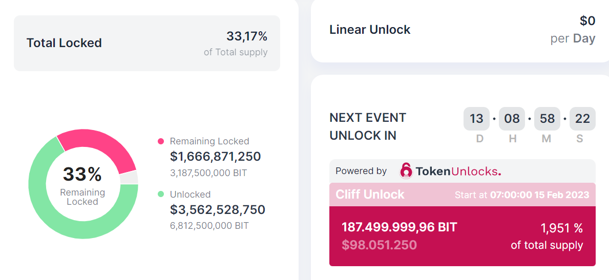 Vào ngày 15 tháng 2, BitDao (BIT) sẽ mở khoá số token trị giá 98 triệu đô la với tổng cộng 187 triệu token BIT được đưa vào lưu thông. Đây là đợt unlock lớn thứ hai sau SAND.