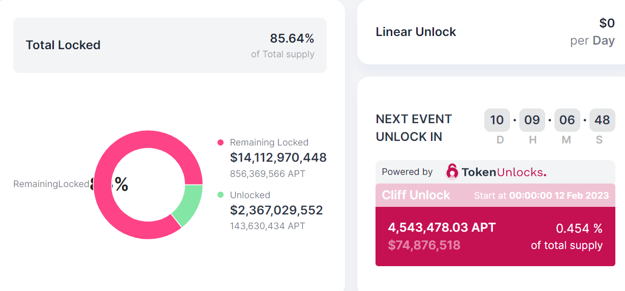 Cuối cùng, đợt mở khóa của APT, dự kiến vào ngày 12 tháng 2, sẽ phát hành 4,5 triệu token trị giá 74 triệu đô la vào lưu thông, đánh dấu đợt mở khóa lớn thứ ba trong tháng.