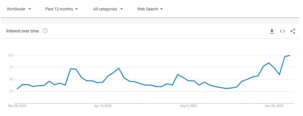 Lượt tìm kiếm “Bitcoin” cho năm 2020 | Nguồn: Google Trends