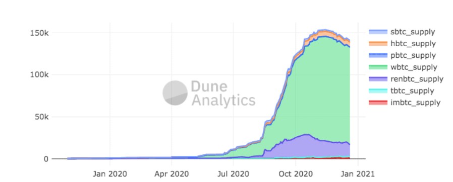 Nguồn cung Bitcoin trên Ethereum tăng mạnh trong năm nay | Nguồn: Dune Analytics