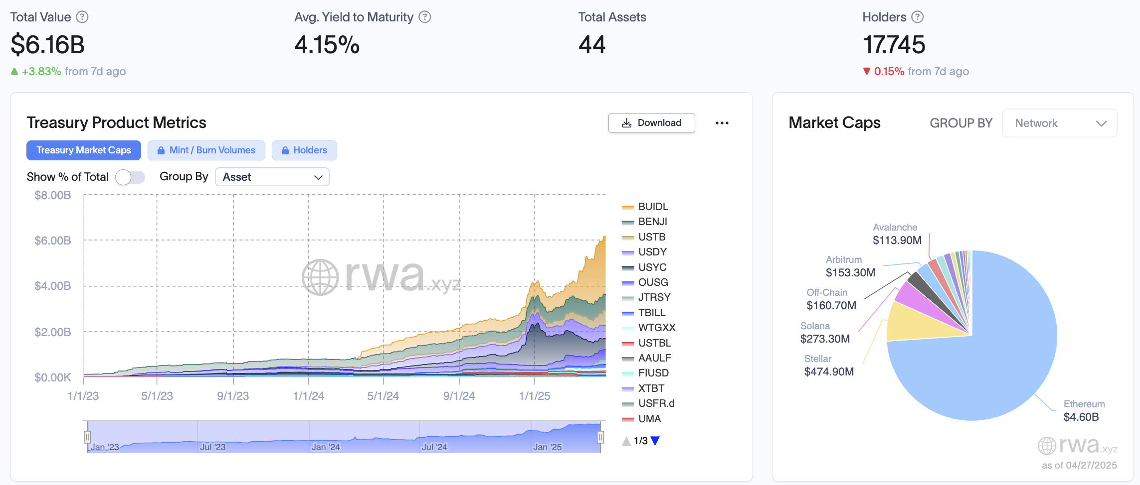 Theo nền tảng dữ liệu RWA.xyz, giá trị trái phiếu kho bạc Hoa Kỳ được token hóa trên blockchain đã tăng từ 4,01 tỷ đô la vào tháng 1 năm 2025 lên 6,16 tỷ đô la tính đến cuối tháng 4 – tương đương mức tăng trưởng 53,62% chỉ trong vòng ba tháng. Sự tăng trưởng ấn tượng này phản ánh mức độ chấp nhận ngày càng lớn của thị trường đối với blockchain như một công cụ hiện đại hóa thị trường thu nhập cố định truyền thống.