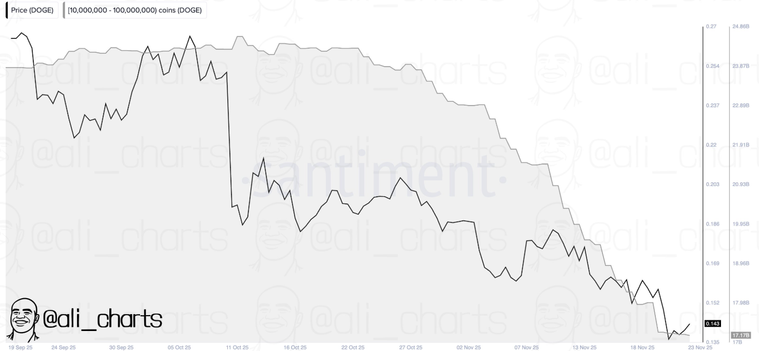 Từ ngày 19/9 đến 23/11, dữ liệu on-chain từ Ali Martinez cho thấy có sự thay đổi lớn trong phân bổ DOGE giữa các ví nắm giữ số lượng lớn. Các ví sở hữu từ 10 triệu đến 100 triệu DOGE đã “bán hoặc phân phối lại” gần 7 tỷ token, làm tổng số DOGE của nhóm này giảm từ hơn 24 tỷ xuống còn khoảng 17,17 tỷ. Đồng thời, giá DOGE cũng giảm mạnh từ 0,27 USD xuống 0,143 USD.