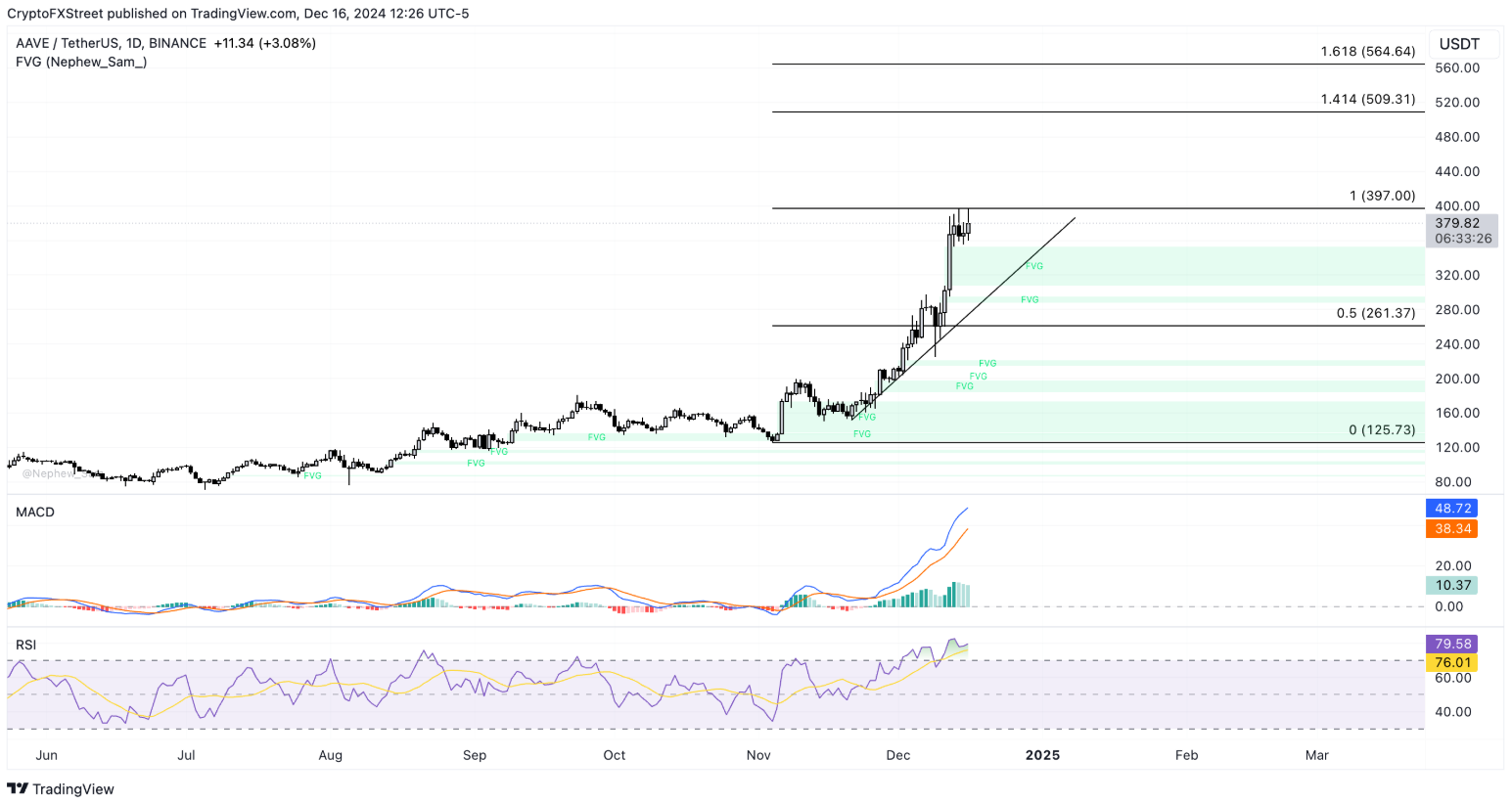 Giá AAVE tăng vọt lên mức cao nhất kể từ năm 2021, đạt đỉnh cục bộ ở $397 vào ngày 16 tháng 12. Kể từ đó, token DeFi này đã điều chỉnh nhẹ và hiện đang giao dịch ở mức $379,82 tại thời điểm viết bài. Các chỉ báo kỹ thuật trên biểu đồ giá hàng ngày củng cố luận điểm tăng giá cho AAVE.