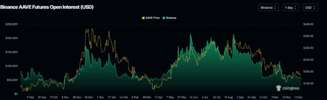 Diễn biến giá kém tích cực trong ngắn hạn của AAVE càng được củng cố khi hợp đồng mở (OI) trên sàn Binance tiếp tục thu hẹp, chỉ còn 56,60 triệu USD trong ngày thứ Tư, tiệm cận mức đáy của cả năm. Sự sụt giảm này phản ánh rõ tâm lý thận trọng của thị trường, khi các trader chủ động đóng vị thế, dòng vốn đầu cơ dần rút lui, trong khi lực mua mới vẫn chưa đủ mạnh để tạo động lực đảo chiều.
