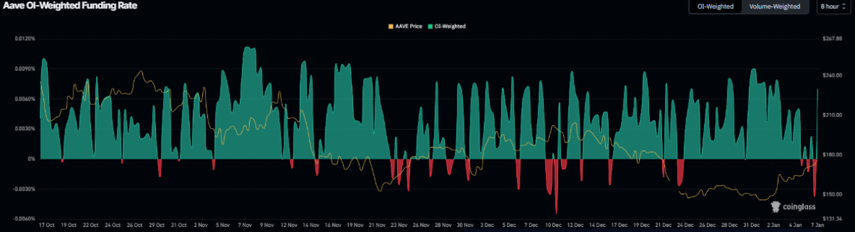Ở mảng phái sinh, tín hiệu tăng giá cũng trở nên rõ nét hơn khi tỷ lệ funding rate của AAVE nghiêng về phe bò. Dữ liệu OI-Weighted funding rate từ Coinglass cho thấy số trader đặt cược vào kịch bản giảm giá đang thu hẹp, trong khi niềm tin vào xu hướng tăng ngày càng lớn.