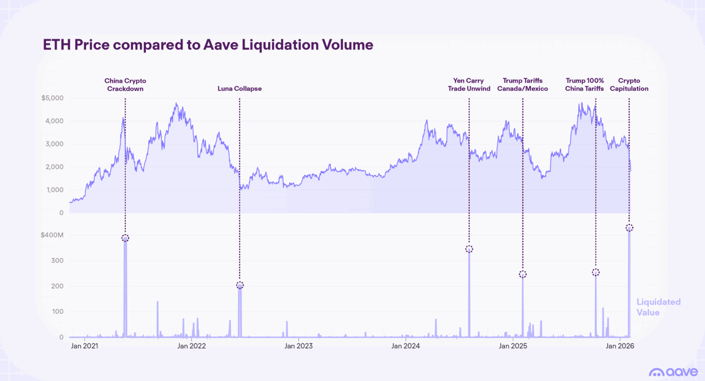 Gần đây nhất, trong giai đoạn từ 31/01 đến 05/02, lập trường “diều hâu” của Fed kết hợp với hoạt động bán cưỡng bức đã đẩy tổng giá trị thanh lý vượt mốc 400 triệu USD – mức cao nhất của chu kỳ hiện tại. Mỗi đợt thanh lý đều khuếch đại biến động giá, song Aave vẫn cho thấy khả năng hấp thụ dòng vốn hiệu quả mà không gây ra gián đoạn mang tính hệ thống.
