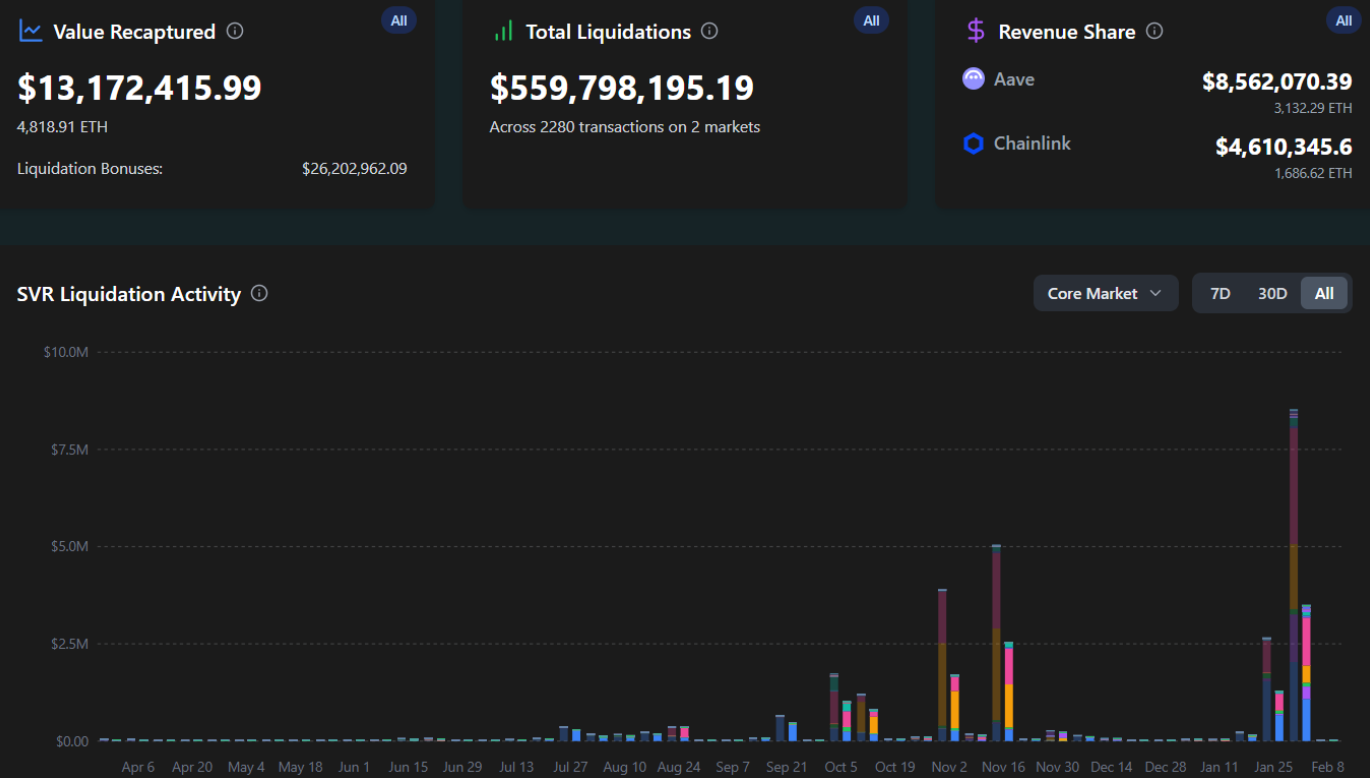 Trong đó, Aave ghi nhận gần 8,56 triệu USD doanh thu, trong khi Chainlink (LINK) thu về khoảng 4,61 triệu USD. Đáng chú ý, các đợt thu hồi giá trị tăng vọt này trùng khớp với thời điểm diễn ra các đợt thanh lý cưỡng bức khi biến động thị trường leo thang, qua đó làm nổi bật hiệu quả của lớp doanh thu mới được triển khai. Quan trọng hơn, Aave đã thành công trong việc chuyển hóa hoạt động thanh lý – vốn thường gắn liền với rủi ro – thành một nguồn lợi suất thực tế.
